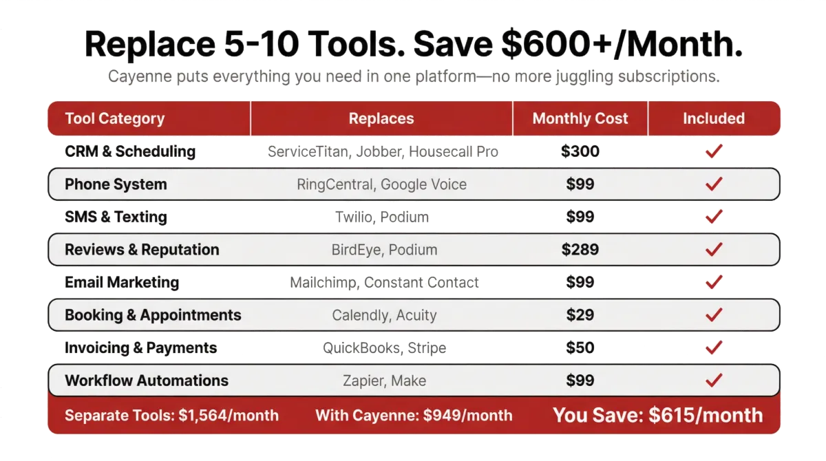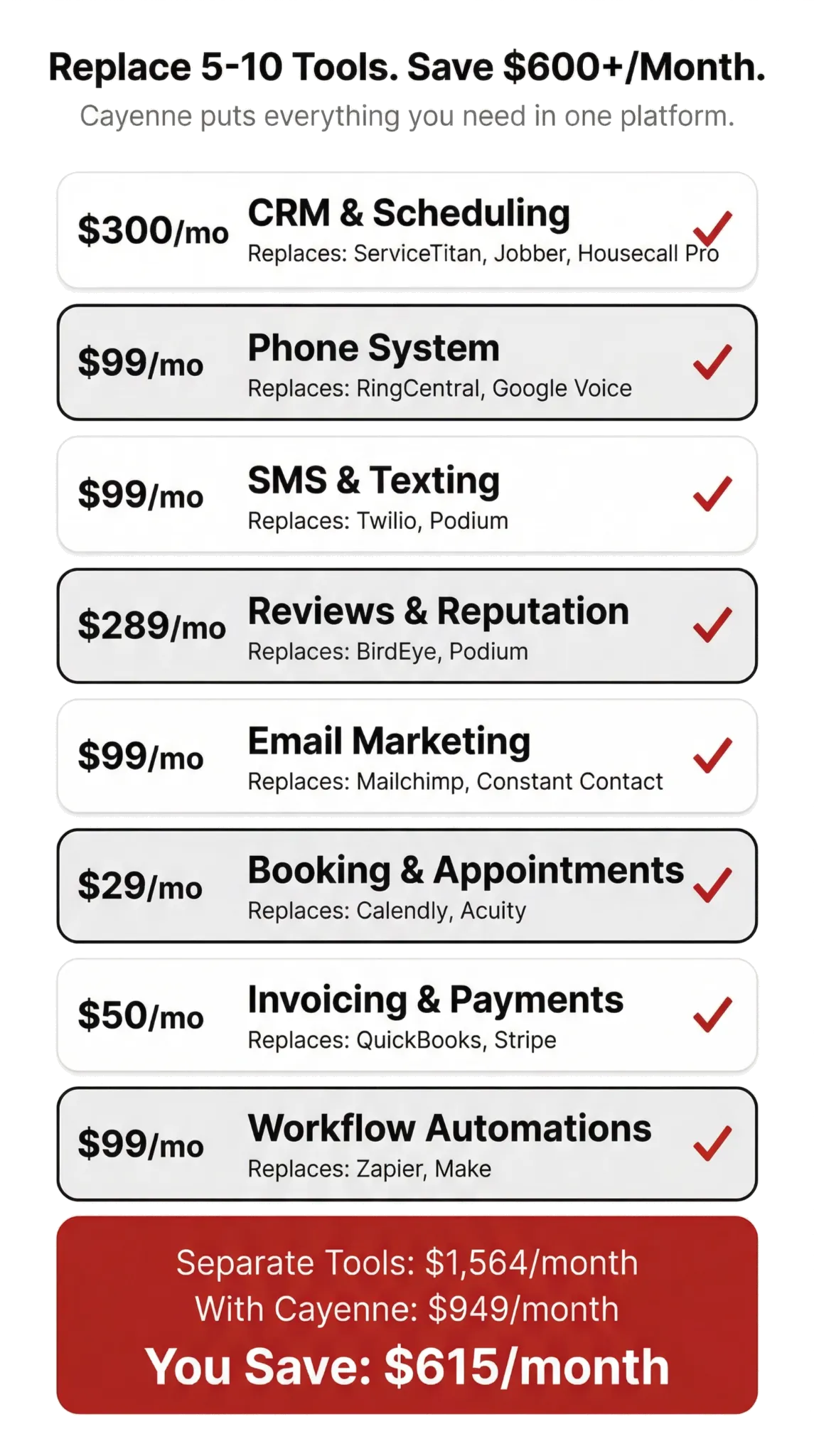 CRMs, texting apps, booking tools, review software, payment links… it adds up. Cayenne consolidates your core operations so everything works together automatically.